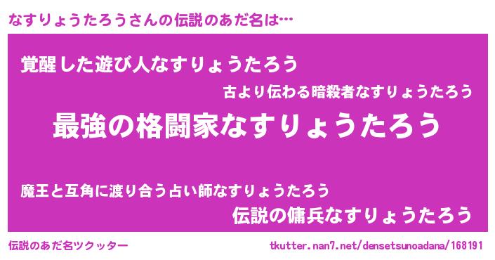 | 男性向けラノベタイトル風あだ名 | 『この素晴らしい世界になすりょうたろうを!』 |