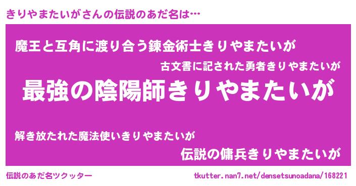 | 意味不明あだ名 | 『きりやまたいがフォーエバー』 |