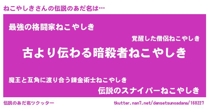 | 胡散臭い通販商品みたいなあだ名 | 『来世でも幸せになれる健康食品…その名も「ねこやしき」』 |