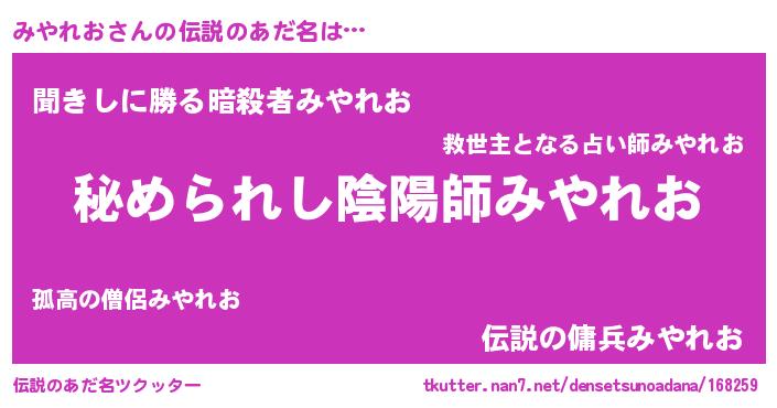 | ヒーロー風カッコイイあだ名 | 『仮面ミヤダー』『ウルトラみやれおマン』 |