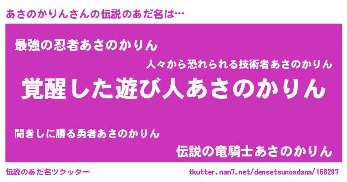 | 男性向けラノベタイトル風あだ名 | 『あさのかりんの嫁は女の子じゃないと思った?』 |