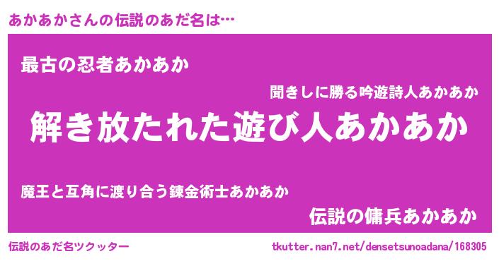 | ヒーロー風カッコイイあだ名 | 『幻影騎士アカ』『ウルトラあかあかマン』 |