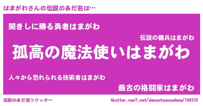 | 胡散臭い通販商品みたいなあだ名 | 『信頼と実績のサプリメント…その名も「はまがわ」』 |