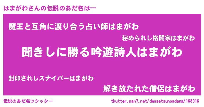 | ヒーロー風カッコイイあだ名 | 『ネオハマガワ』『友情の使者はまがわ』 |