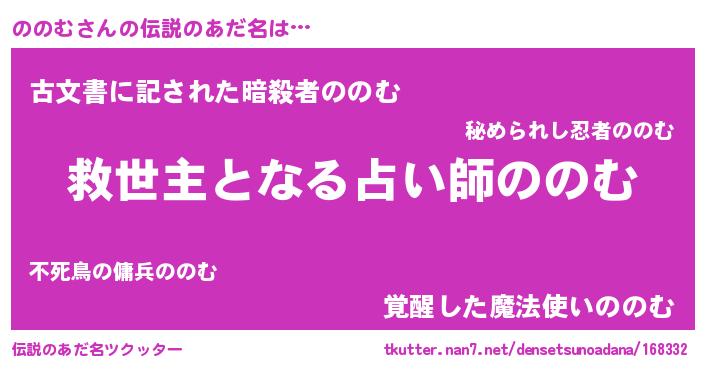 | ヒーロー風カッコイイあだ名 | 『慈愛の使者ののむ』『ネオノノム』 |