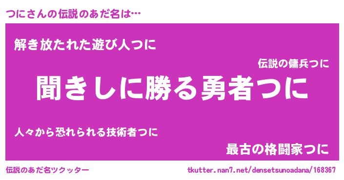 | 胡散臭い通販商品みたいなあだ名 | 『絶対に幸福をもたらす水素水…その名も「つに」』 |
