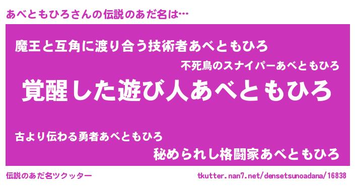 | 男性向けラノベタイトル風あだ名 | 『あべともひろの嫁は女の子じゃないと思った?』 |