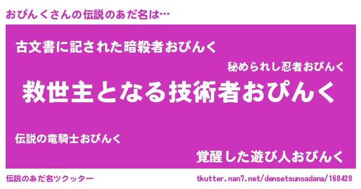 | ヒーロー風カッコイイあだ名 | 『仮面オピダー』『天空の使者おぴんく』 |