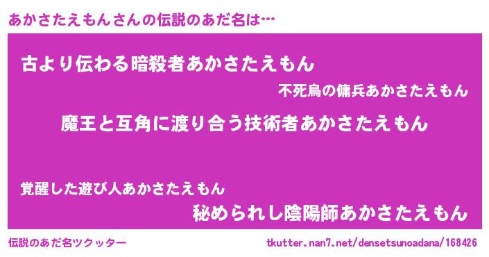 | 意味不明あだ名 | 『住所不定無職あかさたえもん(7歳)』 |