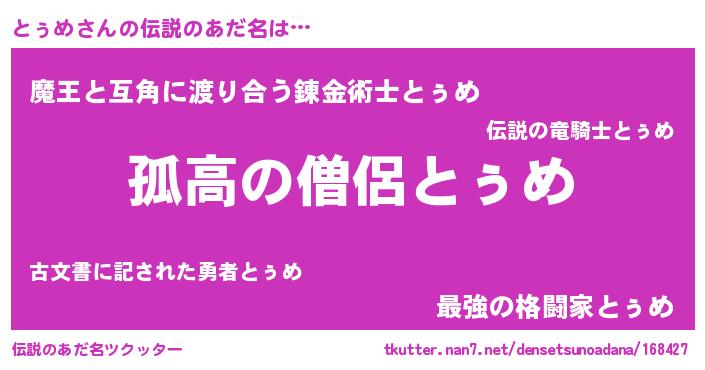 | ヒーロー風カッコイイあだ名 | 『ウルトラ戦士トゥメ』『仮面トゥダー』 |