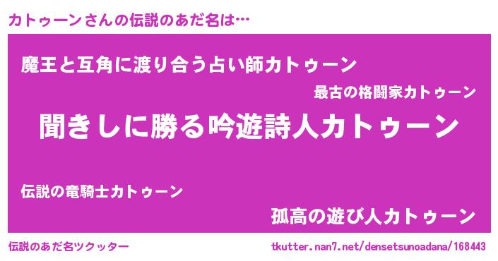 | 意味不明あだ名 | 『永久保存カトゥーン』『自称カトゥーン』 |