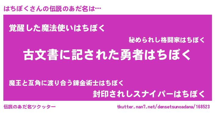 | 男性向けラノベタイトル風あだ名 | 『Re:はちぼくから始める異世界生活』 |
