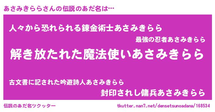 | 男性向けラノベタイトル風あだ名 | 『あさみきららの嫁は女の子じゃないと思った?』 |