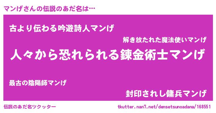 | 意味不明あだ名 | 『自称マンげ』『住所不定無職マンげ(6歳)』 |