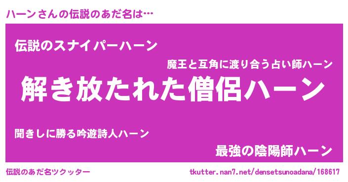 | 意味不明あだ名 | 『とにかく怪しいハーン』『自称ハーン』 |