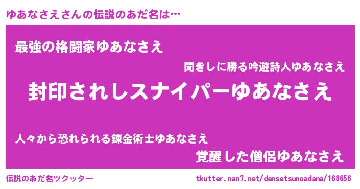 | 恥ずかしいあだ名 | 『プリティーゆあなさえ』『ゆあっちょ』 |