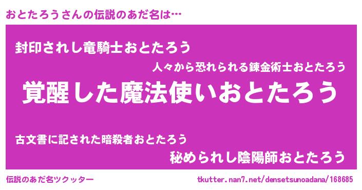 | 男性向けラノベタイトル風あだ名 | 『Re:おとたろうから始める異世界生活』 |