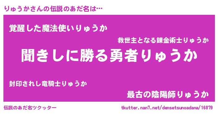 | 女子向けラノベタイトル風あだ名 | 『異世界で失敗しない100のりゅうか』 |