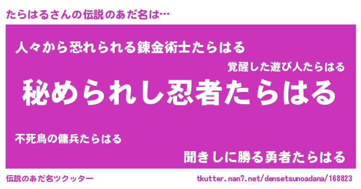 | ヒーロー風カッコイイあだ名 | 『ウルトラたらはるマン』『ネオタラハル』 |