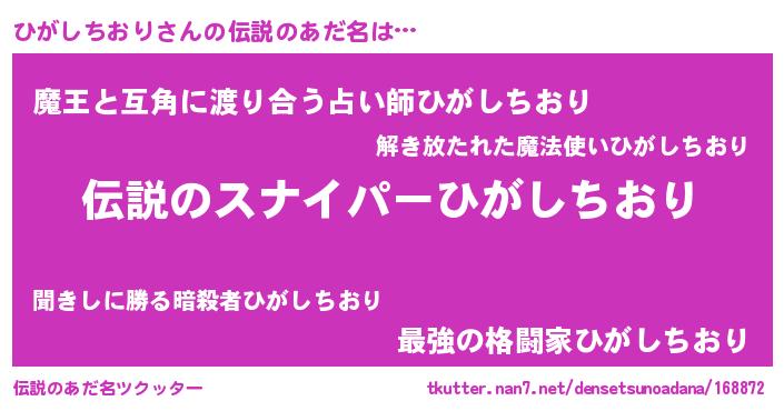 | 男性向けラノベタイトル風あだ名 | 『ヒガシチオリスレイヤー』 |