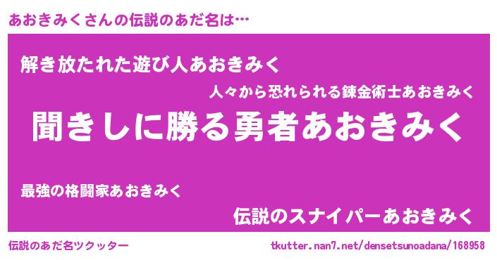 | 意味不明あだ名 | 『住所不定無職あおきみく(93歳)』 |