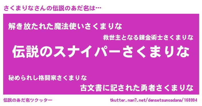 | ヒーロー風カッコイイあだ名 | 『超時空戦士サクマリナ』『仮面サクダー』 |