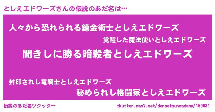 | 女子向けラノベタイトル風あだ名 | 『異世界で失敗しない100のとしえエドワーズ』 |