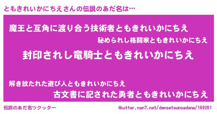 | 男性向けラノベタイトル風あだ名 | 『ともきれいかにちえ~年齢イコール彼女いない歴の魔法使い~』 |
