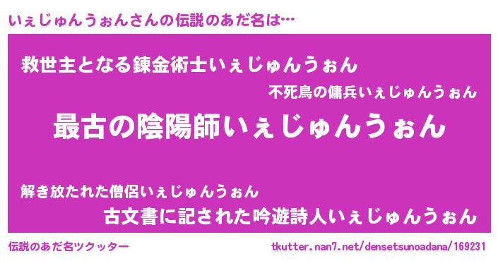 | 男性向けラノベタイトル風あだ名 | 『魔弾の王といぇじゅんうぉん』 |