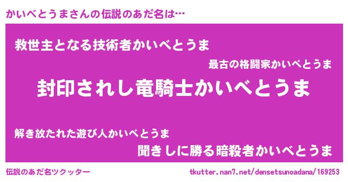 | 意味不明あだ名 | 『住所不定無職かいべとうま(12歳)』 |