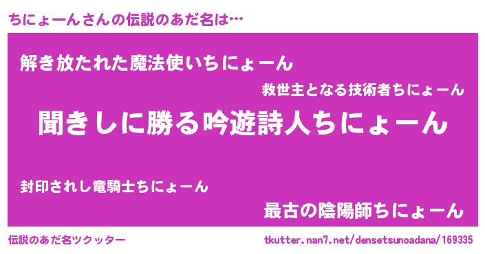 | 男性向けラノベタイトル風あだ名 | 『ちにょーんという概念が存在しない退屈な世界 』 |
