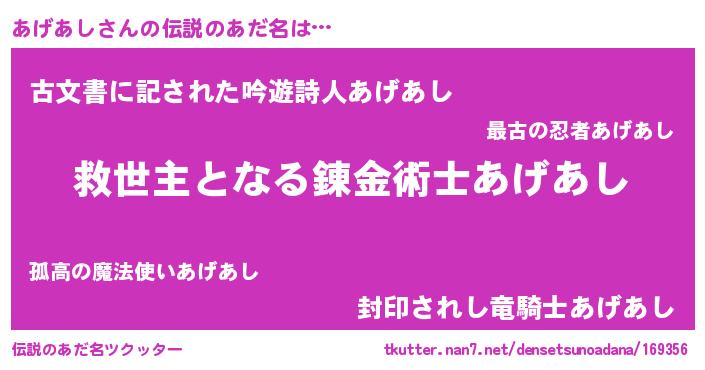 | ヘコむあだ名 | 『あげあし(震え声)』『あげもー』 |