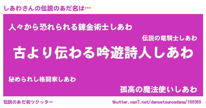 | 意味不明あだ名 | 『永久保存しあわ』『自称しあわ』 |