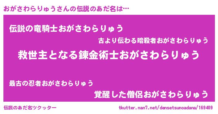 | 男性向けラノベタイトル風あだ名 | 『この素晴らしい世界におがさわらりゅうを!』 |