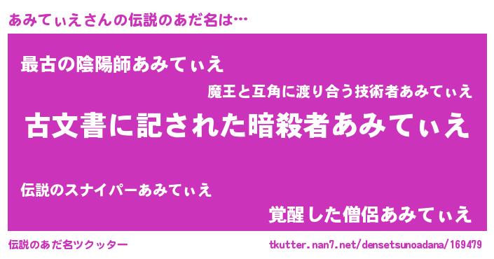 | 意味不明あだ名 | 『永久保存あみてぃえ』『自称あみてぃえ』 |