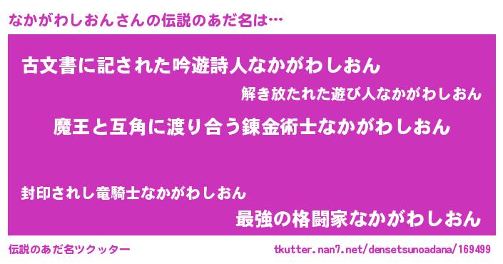 | ヘコむあだ名 | 『なかがわしおん(遠い目)』『酢こんぶ』 |