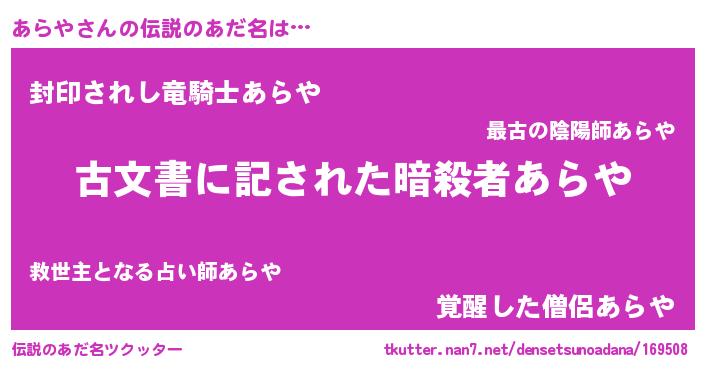 | 意味不明あだ名 | 『永久保存あらや』『ペロリンあらや』 |