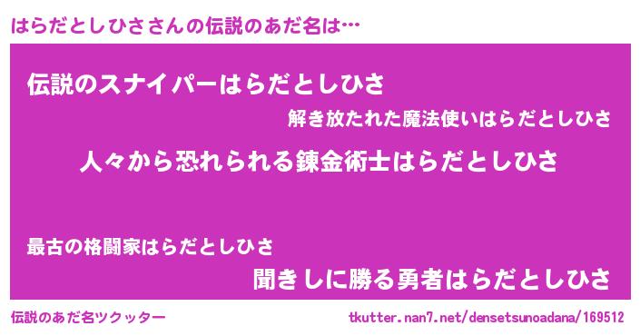 | ヘコむあだ名 | 『はらもー』『はらだとしひさ(遠い目)』 |