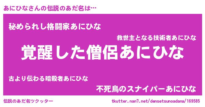 | ヒーロー風カッコイイあだ名 | 『炎刃騎士アニ』『ウルトラあにひなマン』 |