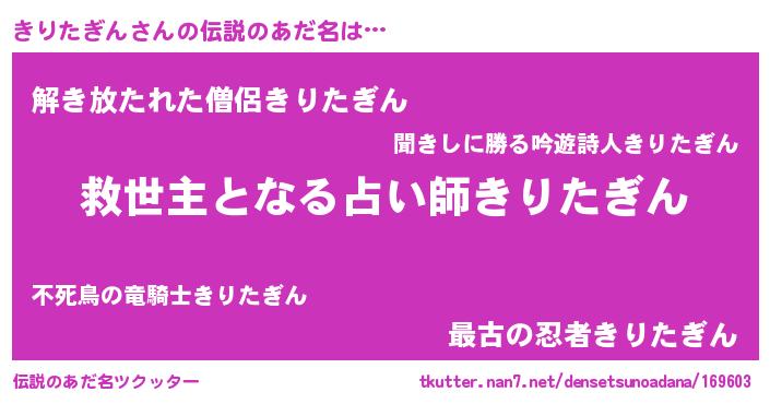 | 男性向けラノベタイトル風あだ名 | 『ノーゲーム・ノーキリタギン』 |