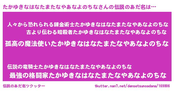 | 胡散臭い通販商品みたいなあだ名 | 『信頼と実績のサプリメント…その名も「たかゆきなはなたまたなやあなよのちな」』 |