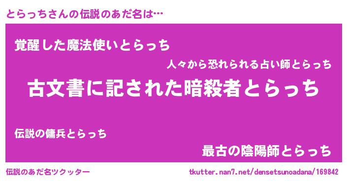 | 胡散臭い通販商品みたいなあだ名 | 『前代未聞の健康食品…その名も「とらっち」』 |