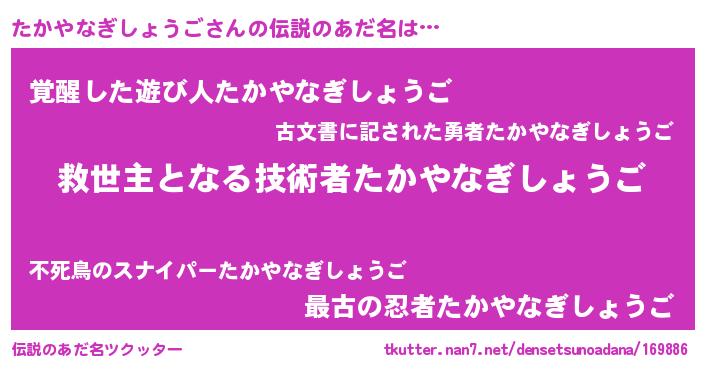 | 男性向けラノベタイトル風あだ名 | 『この素晴らしい世界にたかやなぎしょうごを!』 |