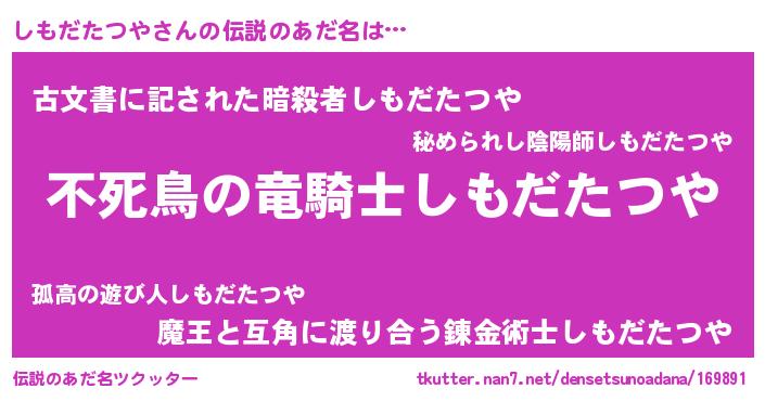 | ヒーロー風カッコイイあだ名 | 『スーパーシモダタツヤ』『仮面シモダー』 |