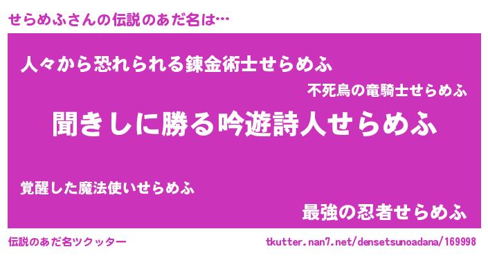 | 男性向けラノベタイトル風あだ名 | 『せらめふという概念が存在しない退屈な世界 』 |