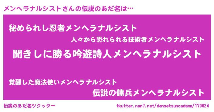 | 女子向けラノベタイトル風あだ名 | 『異世界で失敗しない100のメンヘラナルシスト』 |