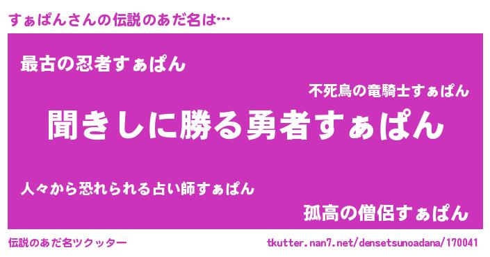 | 胡散臭い通販商品みたいなあだ名 | 『絶対に幸福をもたらす水素水…その名も「すぁぱん」』 |