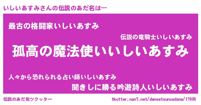 | 女子向けラノベタイトル風あだ名 | 『いしいあすみは平凡を望む』 |