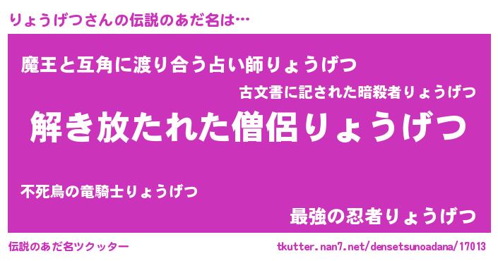 | ヒーロー風カッコイイあだ名 | 『幻影騎士リョ』『友情の使者りょうげつ』 |