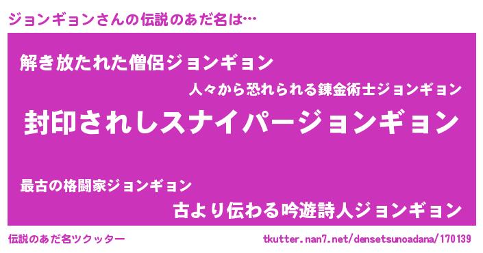 | 男性向けラノベタイトル風あだ名 | 『ジョンギョンアートオンライン』 |